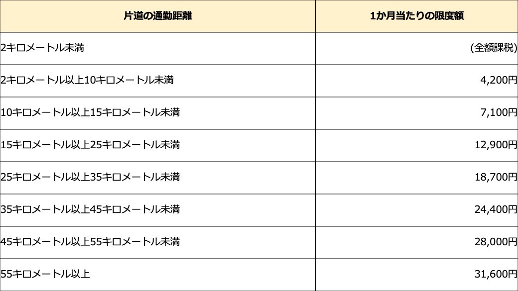 自家用車で通勤している人の非課税となる1ヶ月あたりの限度額は、片道の通勤距離(通勤経路に沿った長さ)に応じて、定められています。
